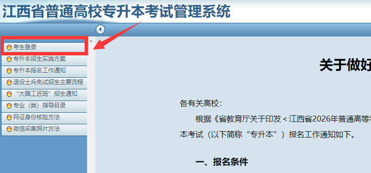 进入“江西省2026年专升本退役大学生士兵补充更改填报免试志愿入口”:https://zsb.jxeea.cn